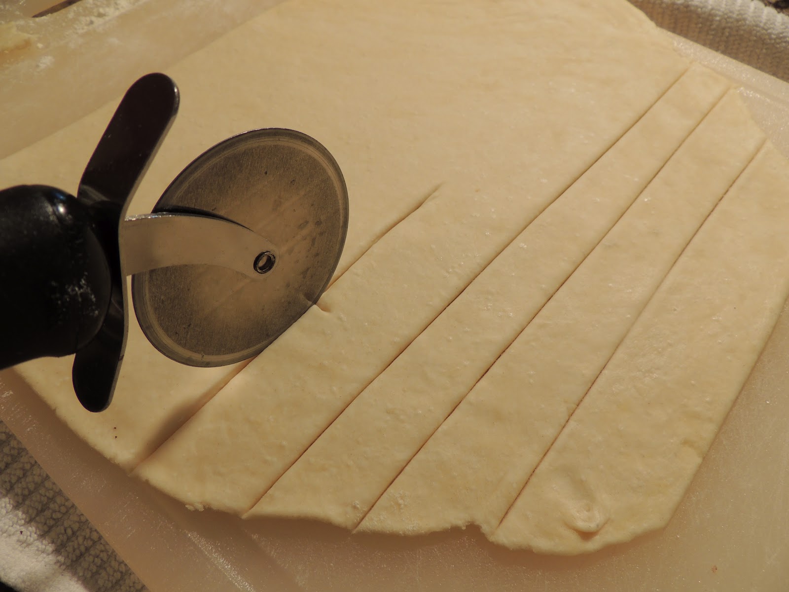 Next, roll out your pie crust and using a pizza cutter, cut your pie crust into strips.