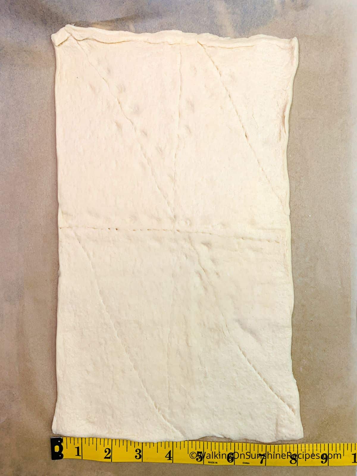 Step 1: Press the seams together and use a pastry roller to roll them out into one sheet of crescent roll dough approximately 8 inches wide by 12 inches long.