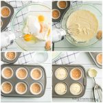 For this recipe, I used two standard 6-cup muffin pans, lined with cupcake liners and lightly sprayed with non-stick spray. It’s not a mini muffin pan (which would make even smaller bites). You’ll end up with about 24 cheesecake cupcakes depending on how full you fill each cup.