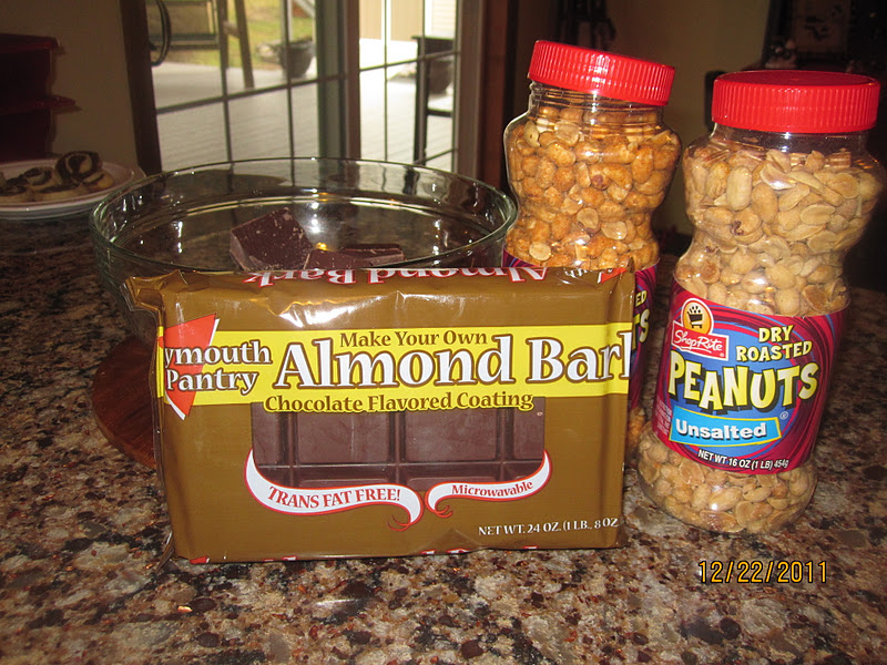 We used the one whole almond bark bar and about 2 cups of peanuts.