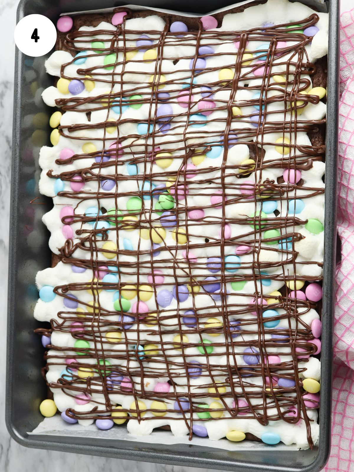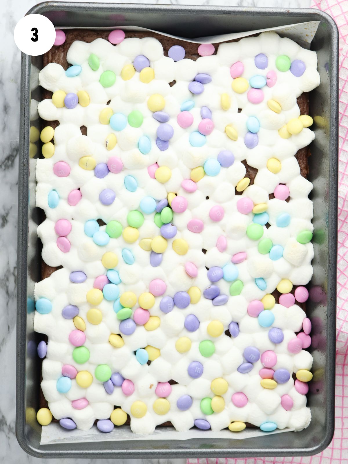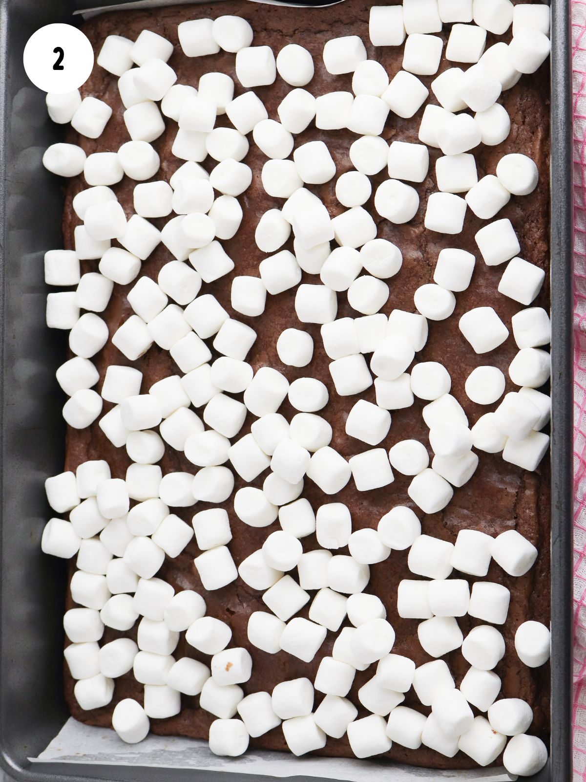 Step 2: Top the baked brownies with mini marshmallows. Regular sized marshmallows is not recommended for this recipe as they will take too long to melt.
