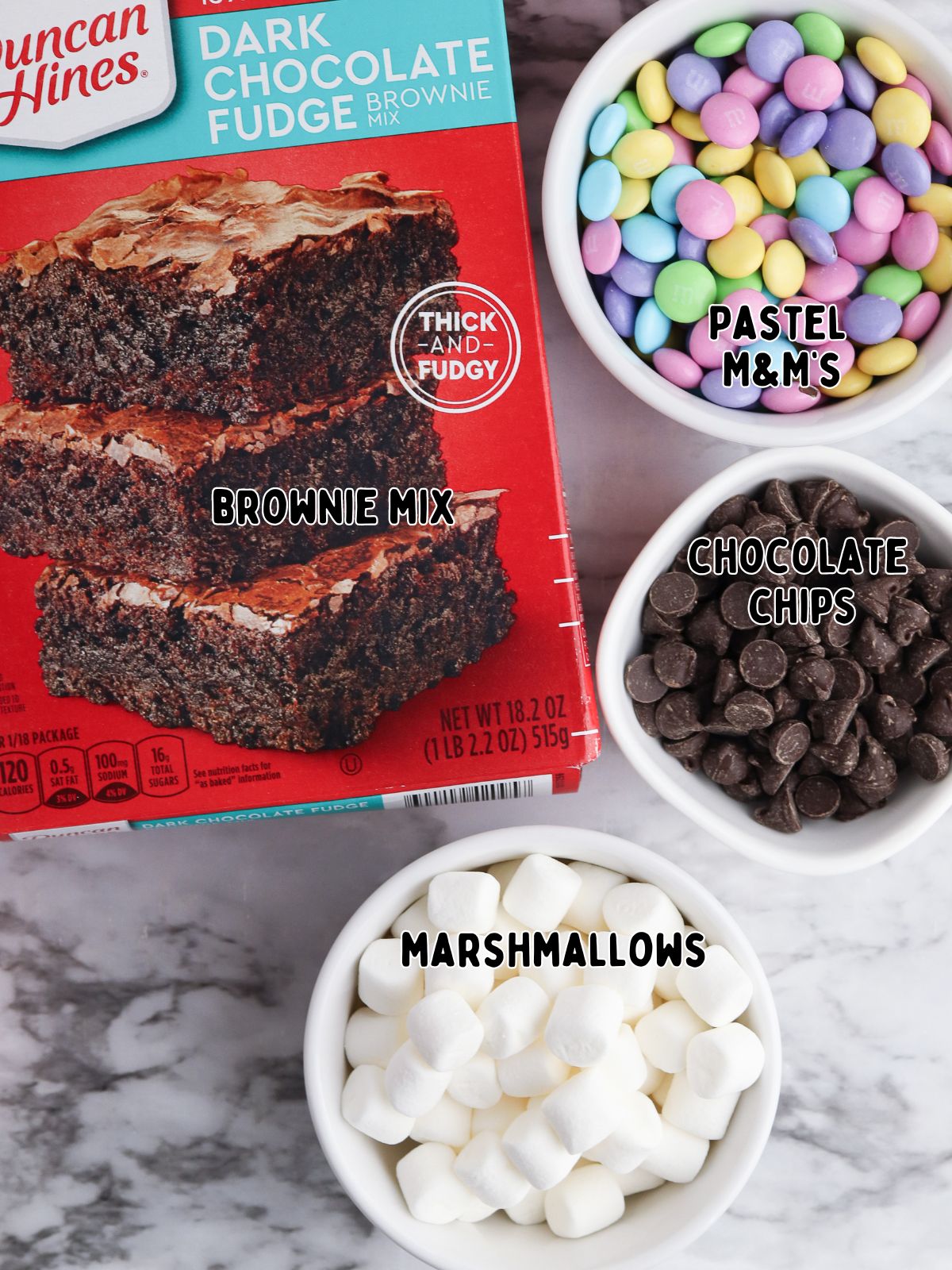 Made with a convenient box mix with gooey melted marshmallows, colorful pastel M&M's, and a decadent chocolate drizzle, this this easy dessert bar recipe is perfect for Easter celebrations!
