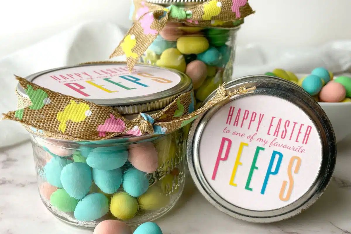 You can fill a mason jar up with colorful and festive Easter candy like jelly beans, mini chocolate eggs and even a few marshmallow Peeps!