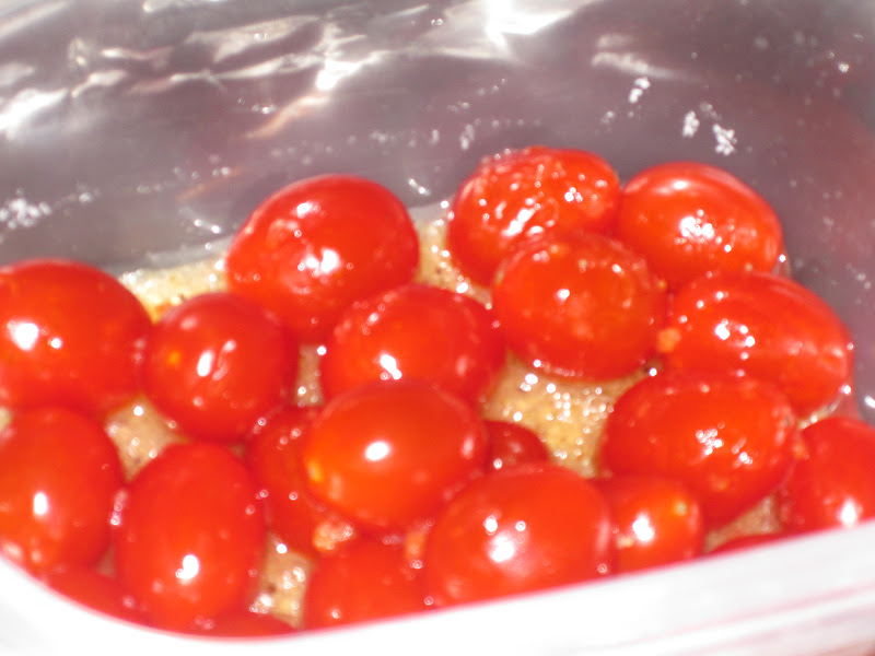 Place the grape tomatoes in a container and add the Italian dressing, pepper and red pepper flakes.