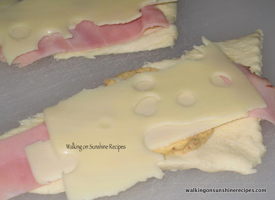 - Spread mustard on top of the crescents and add the ham and cheese.