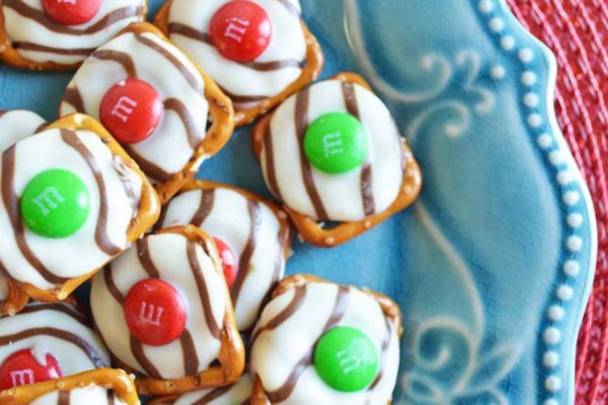 Hugs Pretzels Treats are made with pretzels, chocolate hugs candies and M&M candy pieces. We all need easy, quick treats for the holidays and these are the perfect bite-size treat to snack on while watching a movie with the family or to give as gifts.