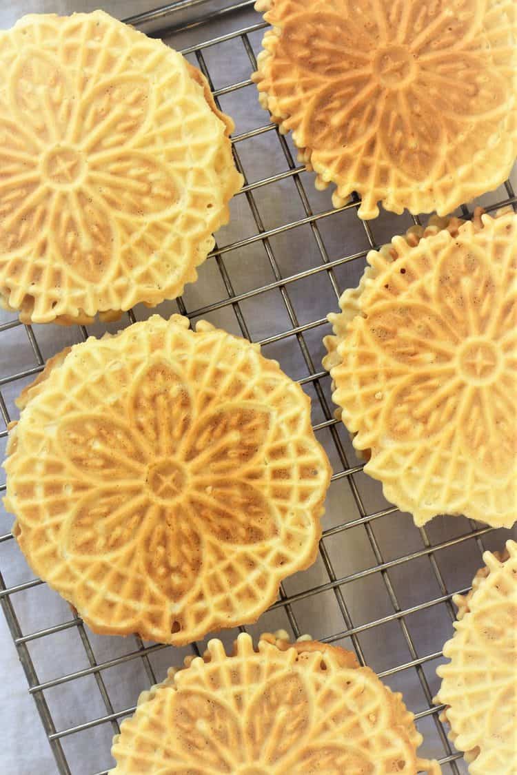 Classic pizzelle are flavored with anise extract or oil. However I’m partial to my mother’s pizzelle recipe subtley flavored with lemon zest and vanilla.