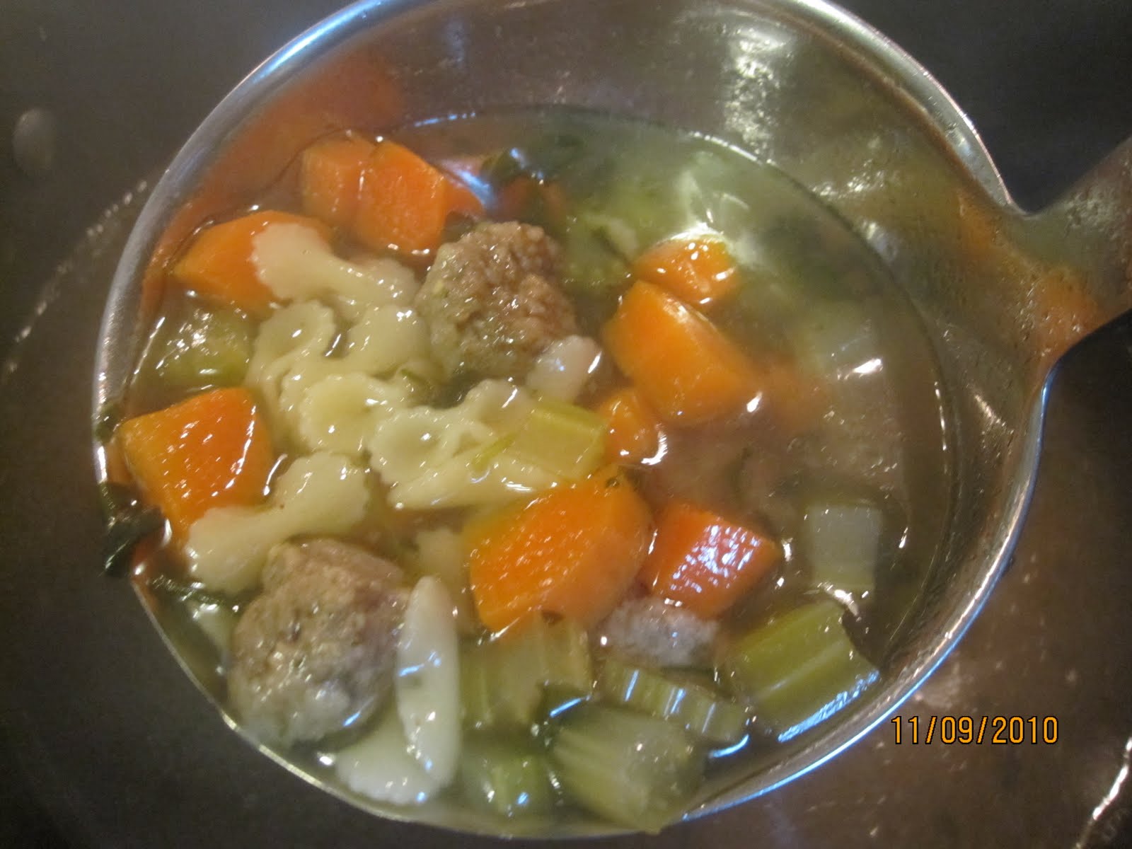 I let the soup cook for about an hour or so until the meatballs are cooked through and the carrots and celery are tender. About 20 minutes before you're ready to serve the soup, cook some pasta