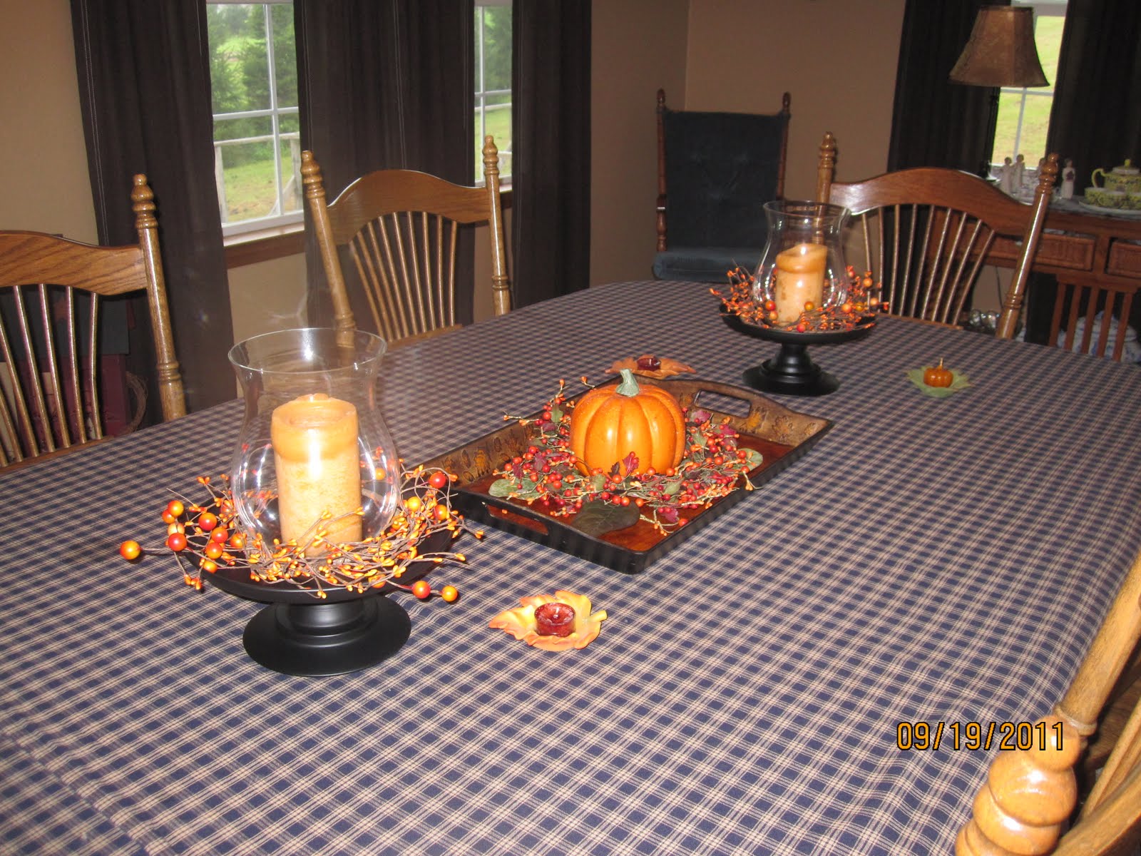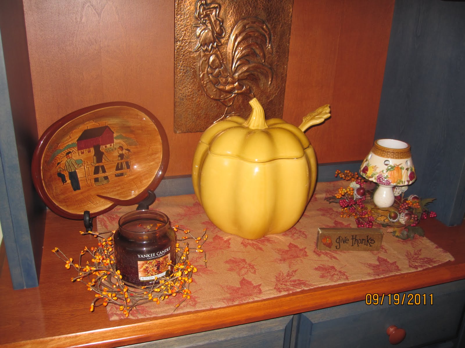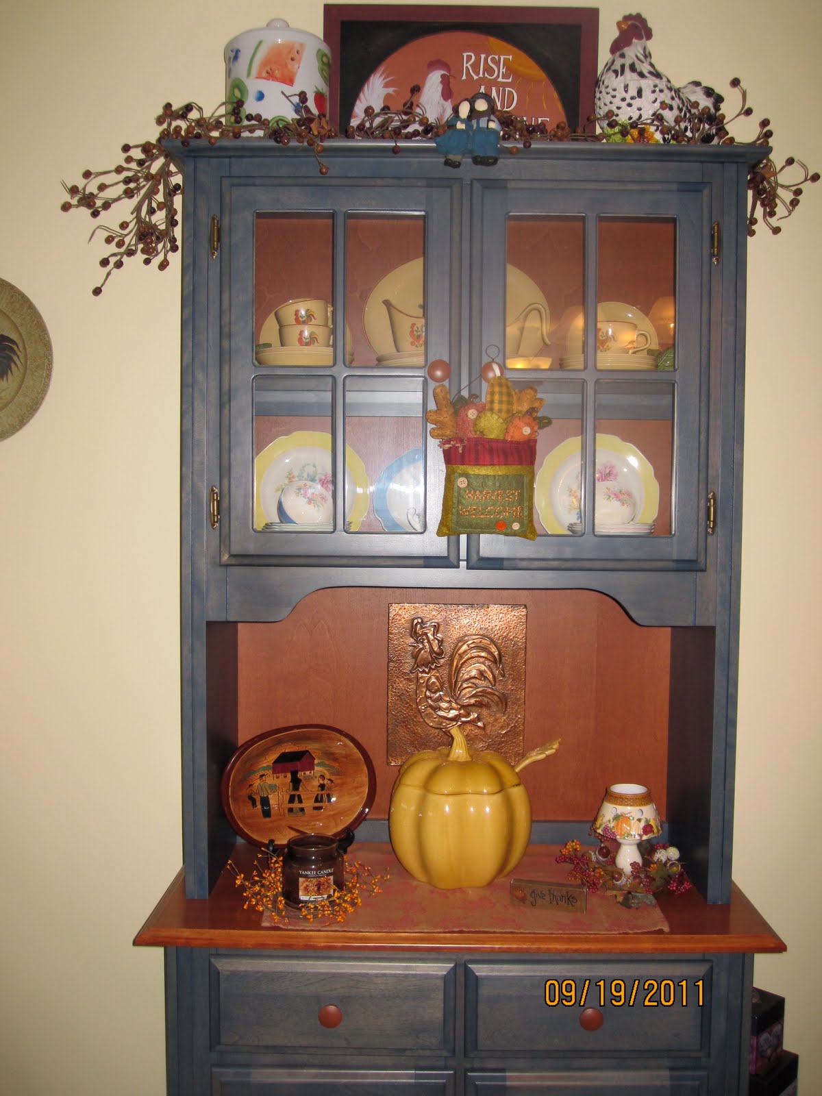 Good morning! I love you Fall decor! and your warm, cozy house in general. The hutch is REALLY good and I like the way you have it done up. I also like the tablecloths etc. I decorated right after Labor day. Like you, I don't have alot (or what I haven't had for years anyway) but I love it too. Have a wonderful week-end! HUGS