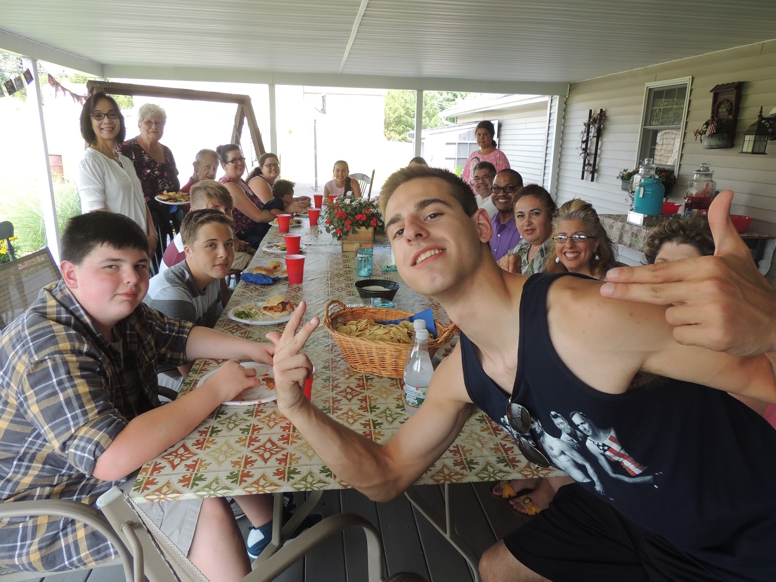 The back porch before everyone arrived. For a few years now my hubby has extended our back porch table with plywood to make our table BIG enough to fit a lot of people. We cover it with inexpensive flannel back tablecloths that are stapled to the plywood. The tablecloths are easy to clean and are easy to change if they get damaged. With an "assortment" of chairs, we are able to fit 20 people around this extended table. We also had our dining room set up for guests to sit and eat as well.