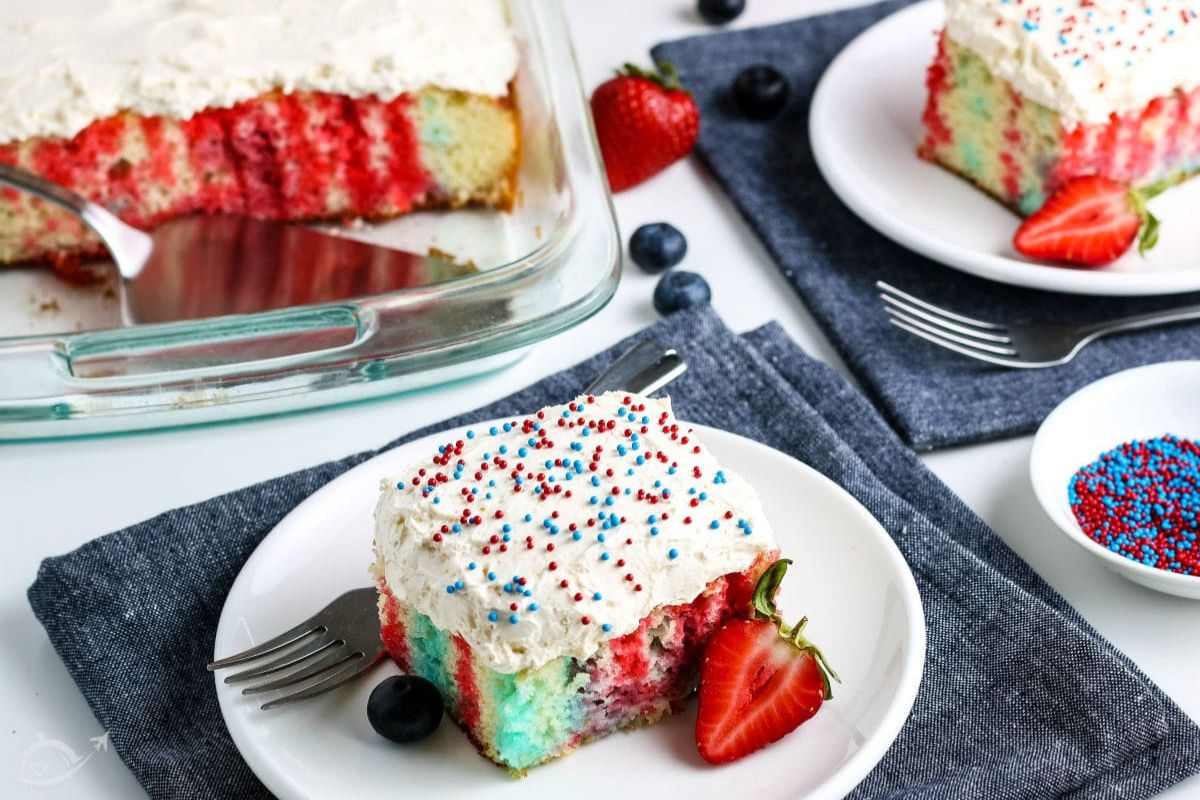 If you are celebrating the 4th of July, Labor day, Veterans day, or any occasion that needs a patriotic touch, this easy and delicious red, white and blue poke cake is a must make. With a creamy frosting on top of tender cake, you can add sprinkles, edible glitter or even red and blue fruits as decorations.