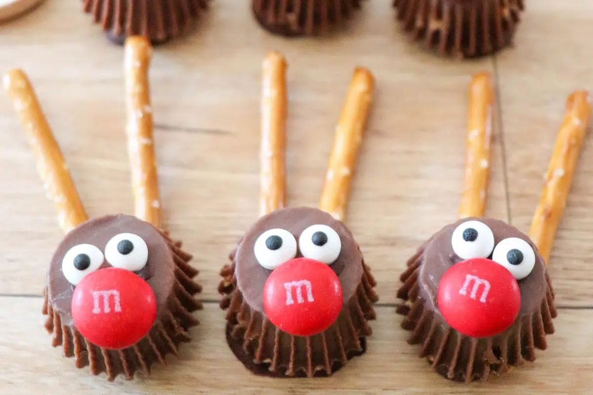 - For this recipe, I used mini chocolate peanut butter cups for the reindeer faces, and then add pretzel sticks for the antlers.