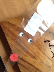 - Glue on googly eyes and a red pom-pom nose to the front of the bag.