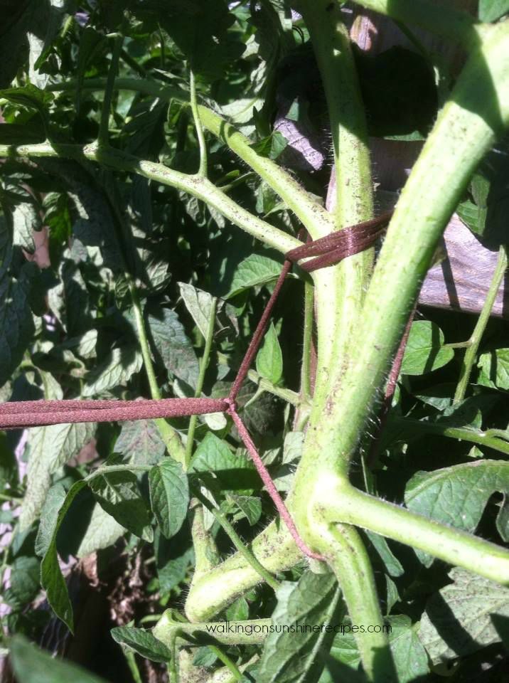 Cut up a pair of pantyhose into strips and gently secure the tomato branches to the wooden frames. As the tomatoes continue to grow, the pantyhose "stretches" with them and doesn't break like rope or string will. The tomato branches won't break off either.
