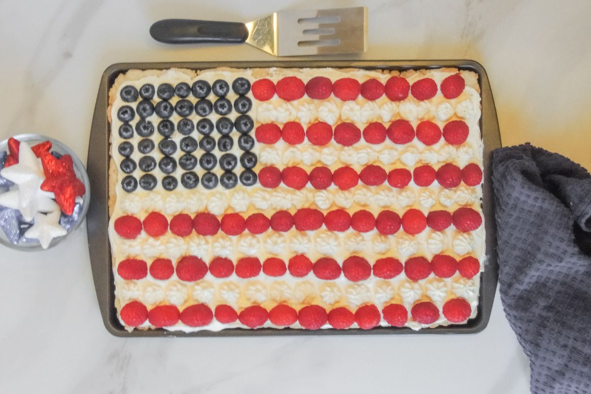 This no-bake cake is perfect for a summer party. It uses cool whip, graham crackers and three kinds of berries to make a stunning sweet that is worthy of your 4th of July party, but is so easy you might want to make it for dessert at home on a random night.