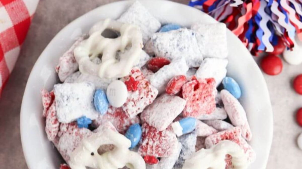 Taking puppy chow to a fourth of July party is a great idea! This easy no bake snack is red, white and blue and has candy mixed in for a snack you can grab a cup of and munch on as you talk to friends or watch the fireworks.